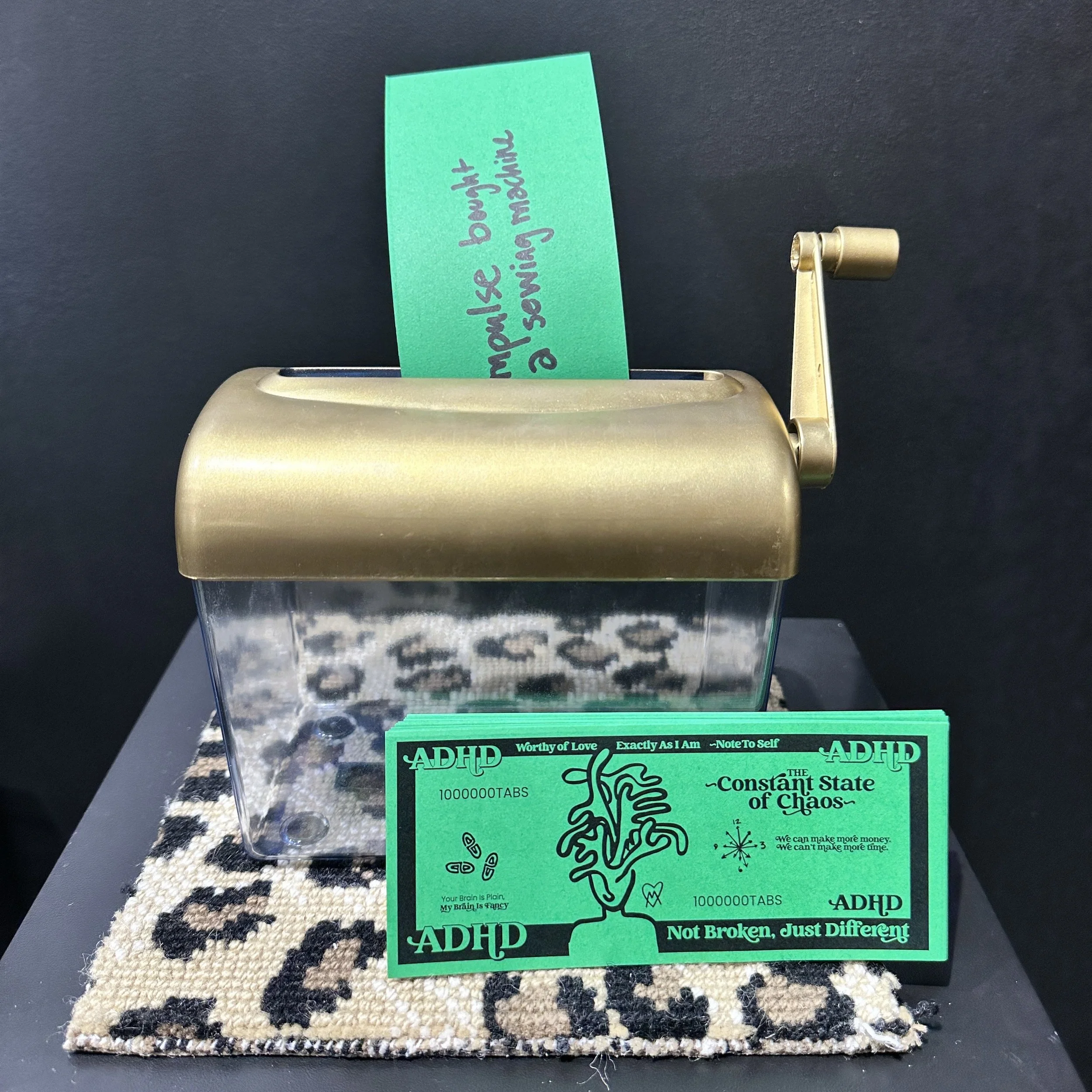 An interactive piece which explores the ADHD Tax. Guests are invited to write about something they spend money on mindlessly, impulsively, or in order to manage their ADHD on the back of funny money, then shred it.
