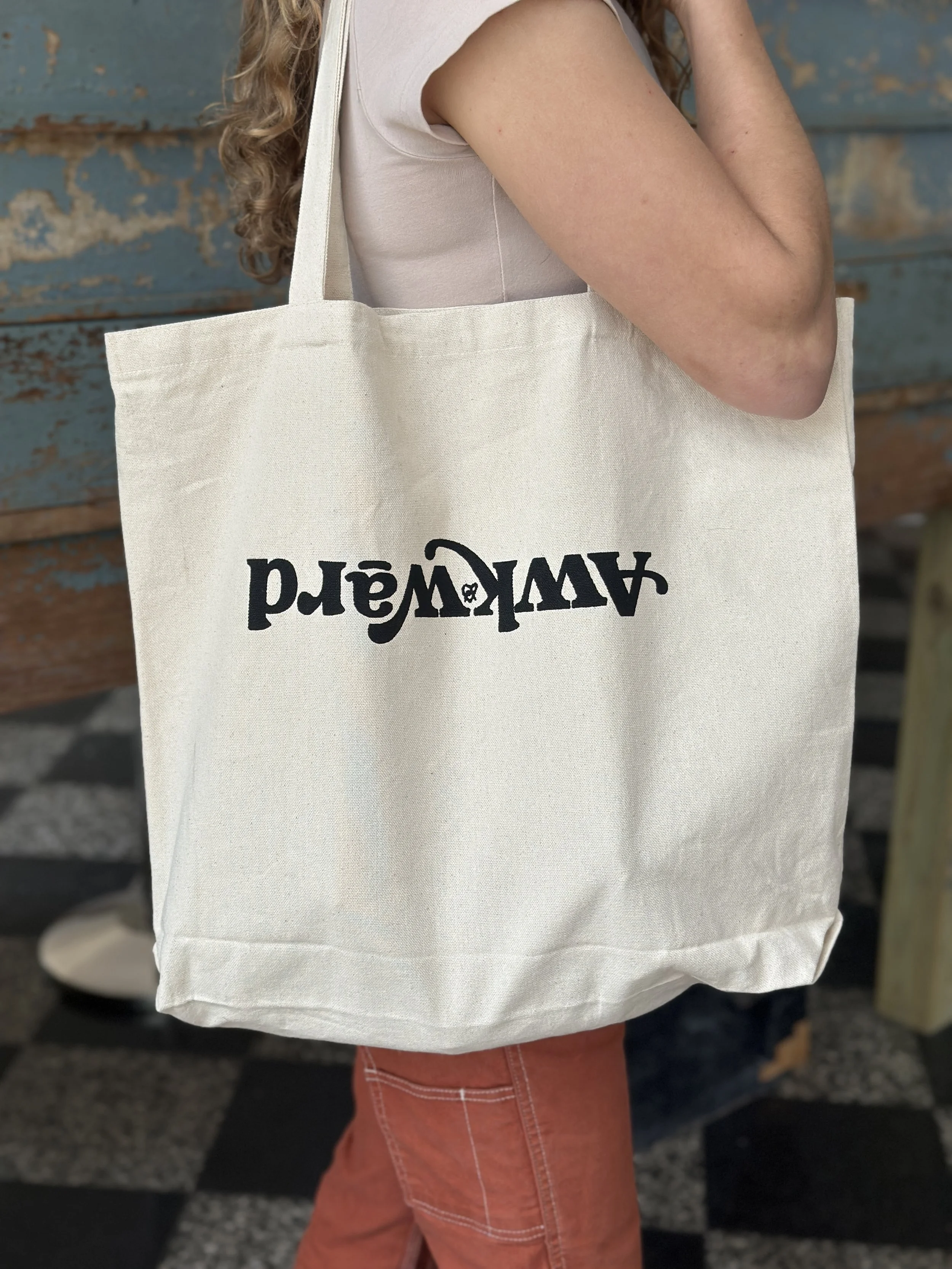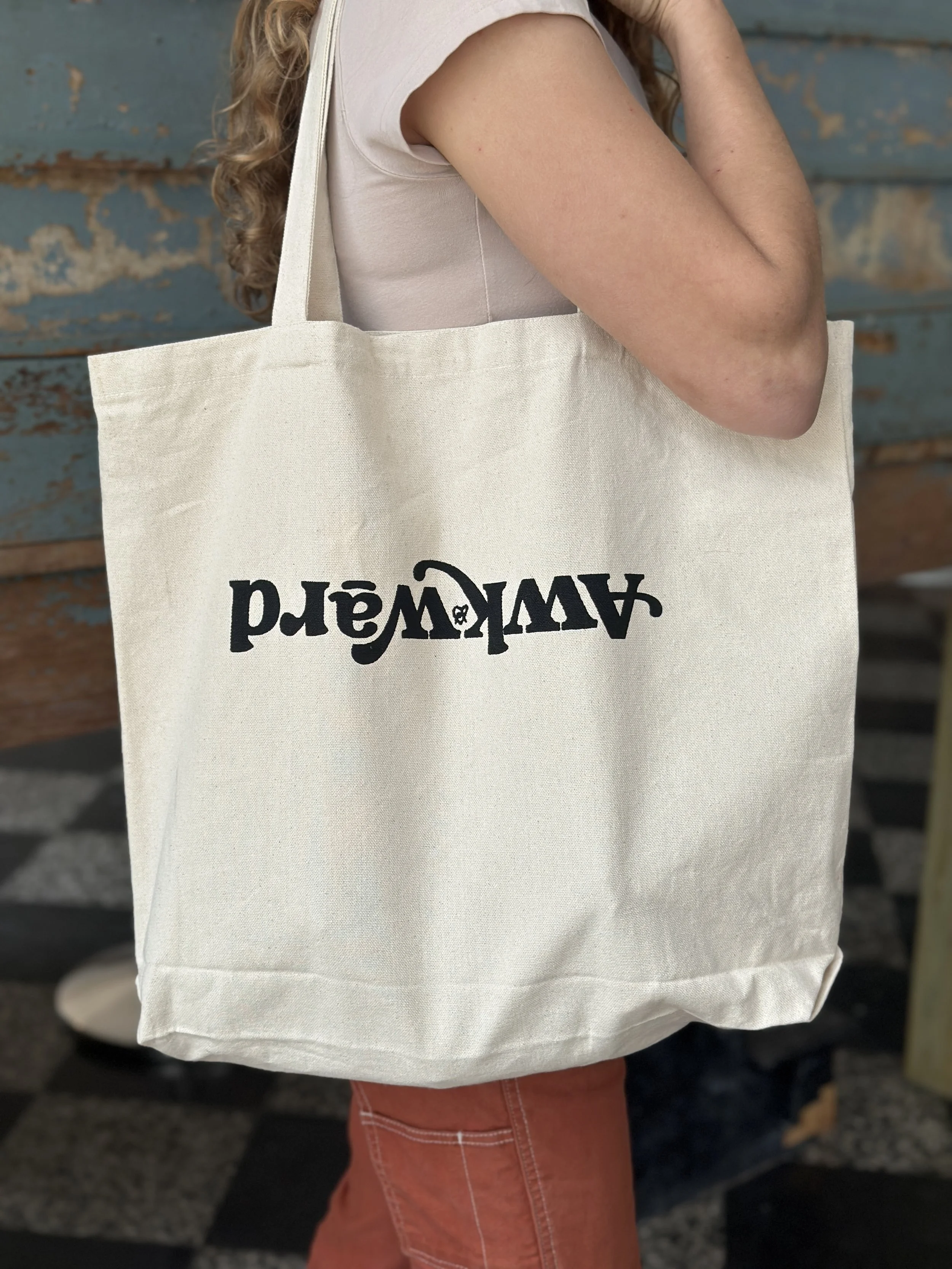 Image 1 of 2 Image 2 of 2 Awkward Tote $30.00 18” x 16” x 3” silkscreened 100% cotton tote featuring the word “Awkward” upside down. Hand wash, cold water, hang to dry. Quantity: Purchase Added! 18” x 16” x 3” silkscreened 100% cotton tote featuring the word “Awkward” upside down. Hand wash, cold water, hang to dry. You Might Also Like Daydreamer Cloud Earrings $25.00 Not Broken, Just Different Sweatshirt $35.00